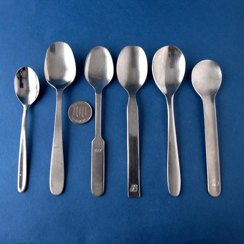 ・大きさの参考に今回入手したいろんな航空会社のティースプーンと100円玉を並べてみました。