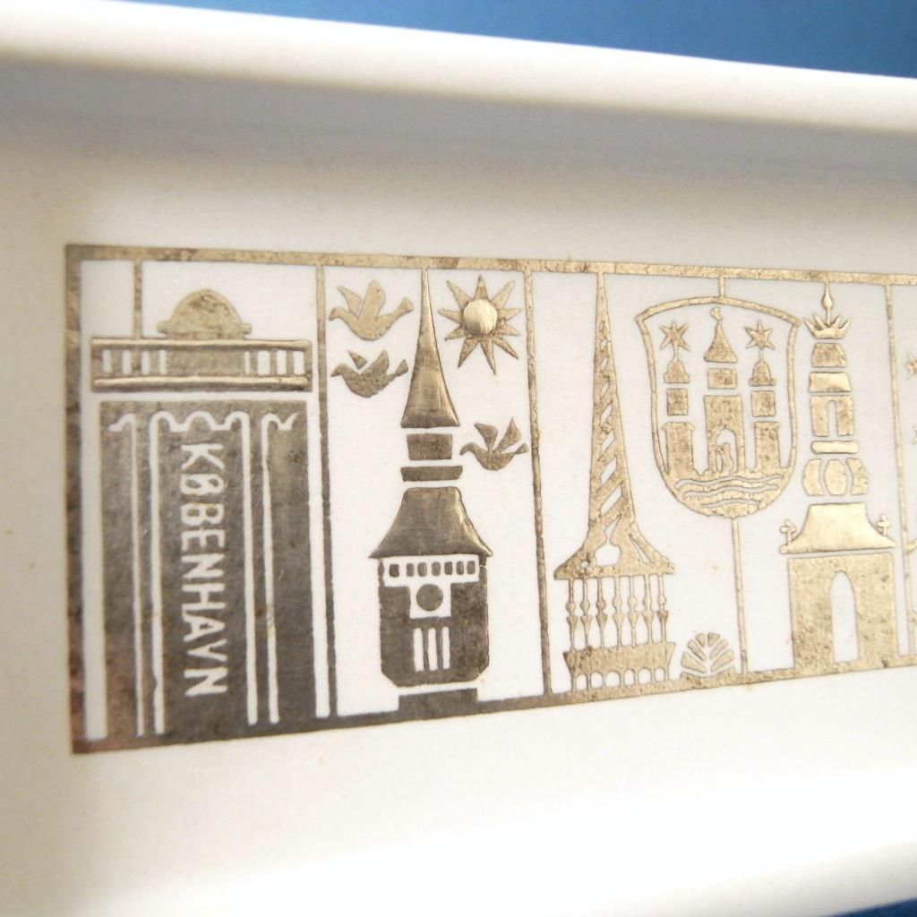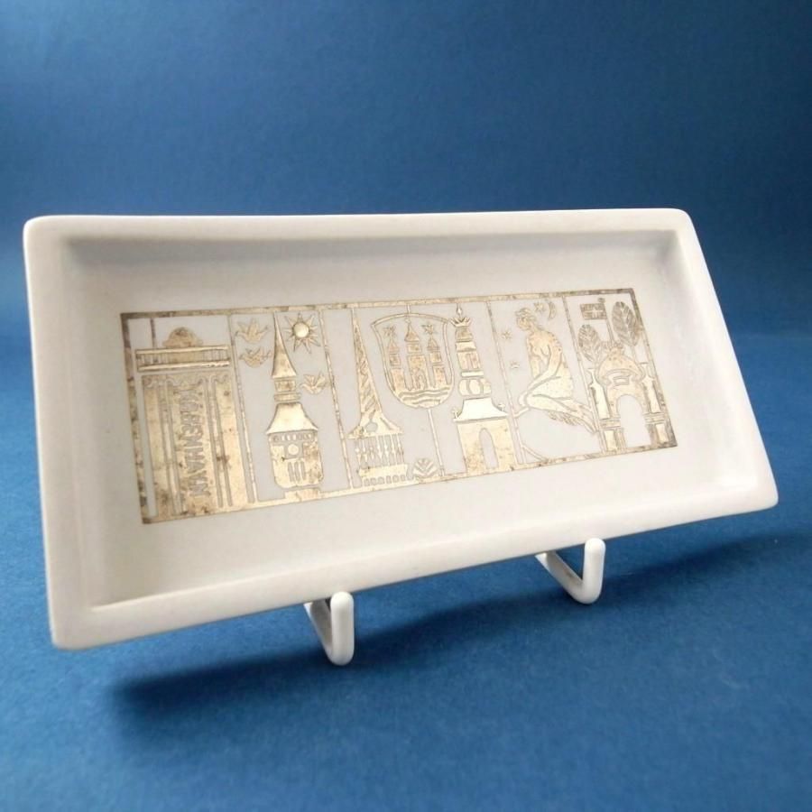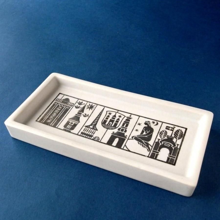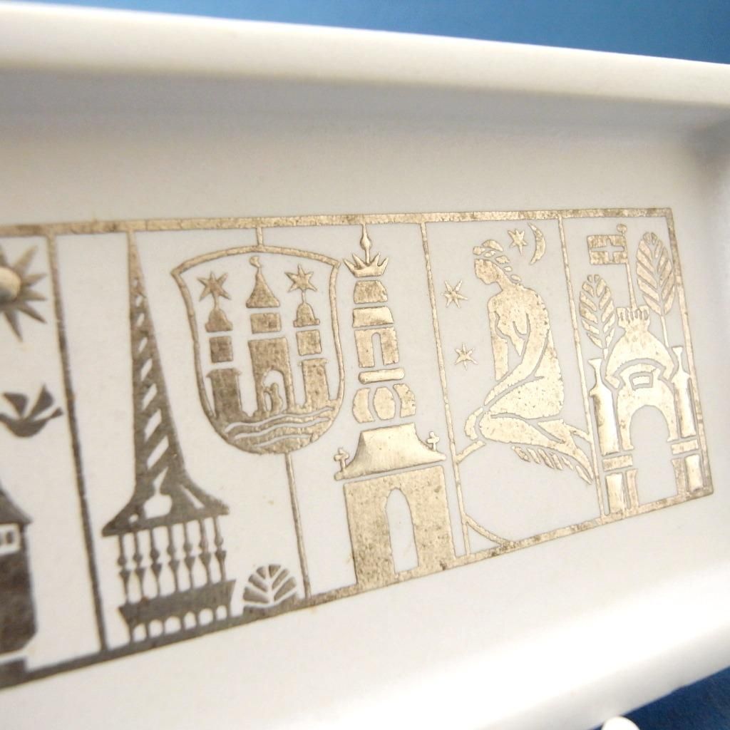 アイコン的な建物、場所、市の紋章がマットな白地のトレイにシルバー(銀)で描かれています。