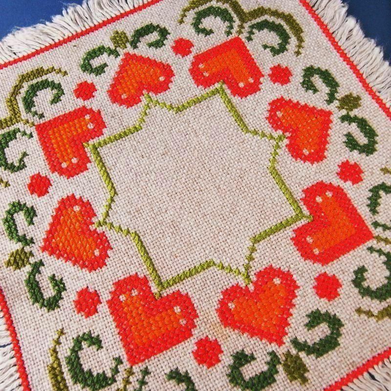 ・クロスステッチで表現されたハートの花?^^が、とても可愛い魅力的な手作りのアイテム。