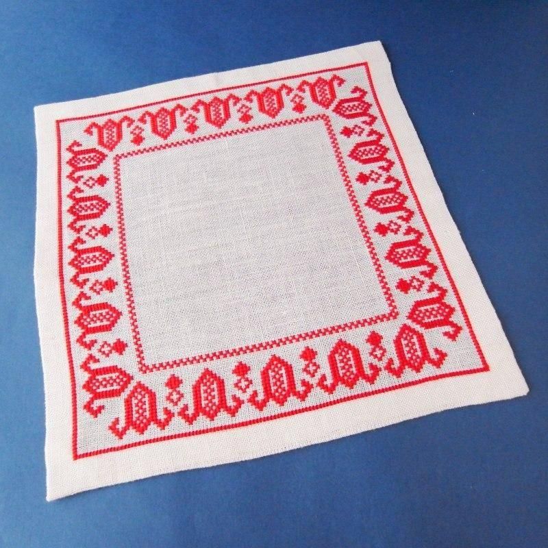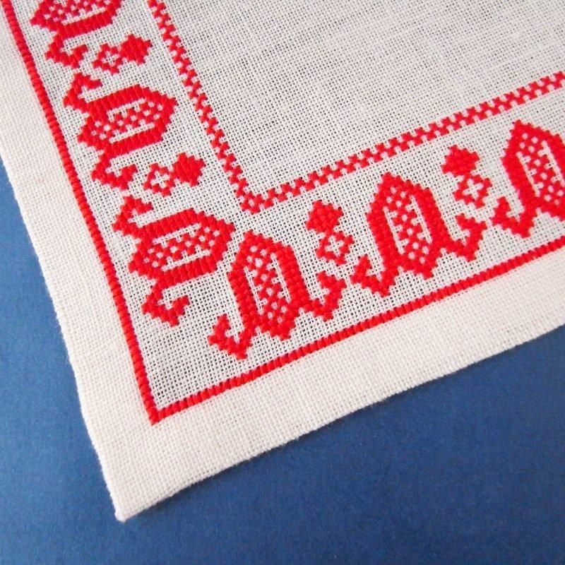 ・この模様は何でしょうね?赤い糸を使ってクロスステッチで表現された魅力的なアイテム。